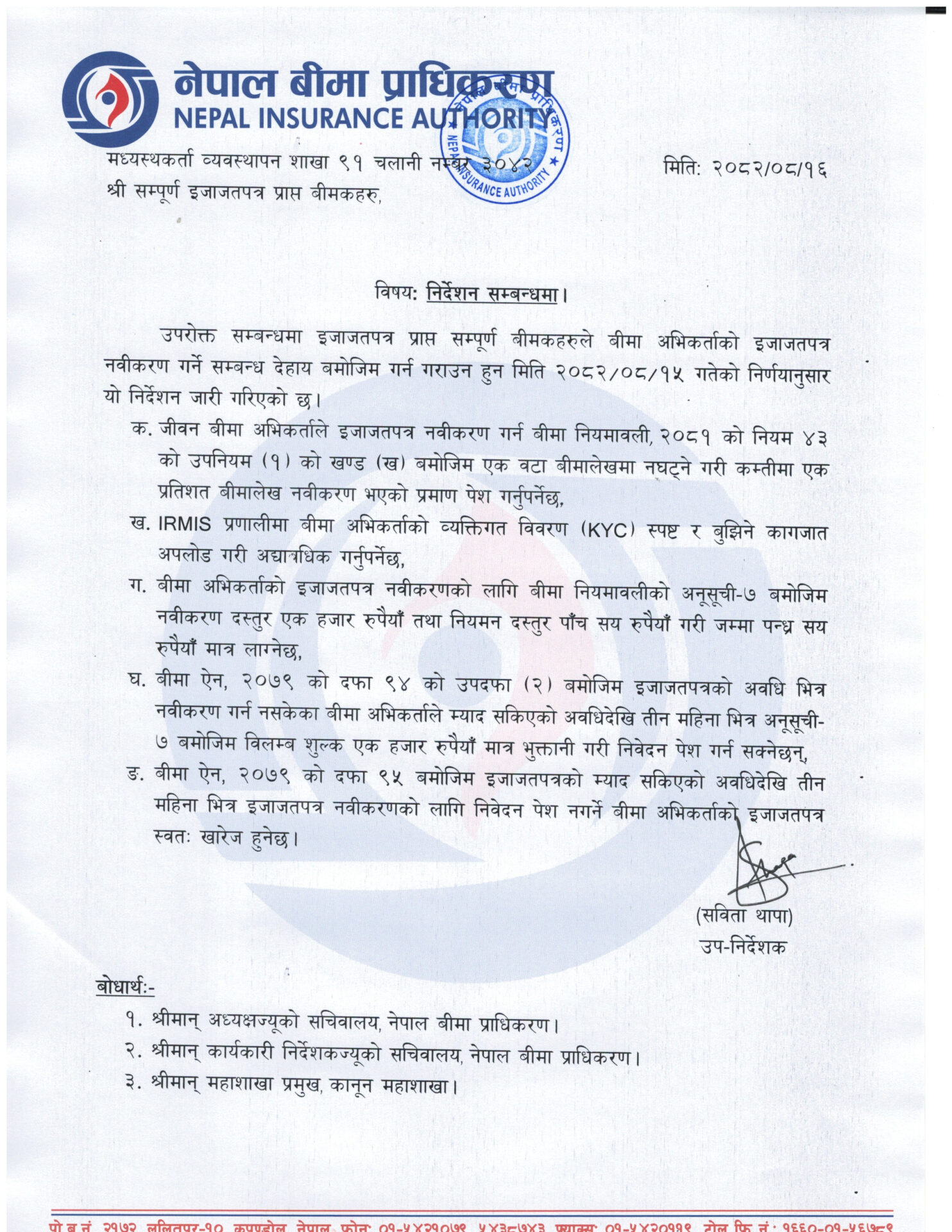 जीवन बीमा अभिकर्ताले इजाजतपत्र नवीकरण गर्न कम्तीमा १ प्रतिशत बीमालेख नवीकरण भएको प्रमाण पेस गर्नुपर्ने भएको छ । नेपाल बीमा प्राधिकरणले आइतबार गरेको निर्णयअनुसार बीमा कम्पनीहरूलाई सो सम्बन्धी निर्देशन जारी गरेको हो । प्राधिकरणका अनुसार जीवन बीमा अभिकर्ताले इजाजतपत्र नवीकरण गर्न बीमा नियमावली, २०८१ को नियम ४३ को उपनियम (१) को खण्ड (ख) बमोजिम एउटा बीमालेखमा नघट्ने गरी कम्तीमा १ प्रतिशत बीमालेख नवीकरण भएको प्रमाण पेस गर्नुपर्नेछ । त्यसैगरी, आईआरएमआईएस प्रणालीमा बीमा अभिकर्ताको व्यक्तिगत विवरण ९केवाईसी० स्पष्ट र बुझिने कागजात अपलोड गरी अद्यावधिक गर्नुपर्नेछ । बीमा अभिकर्ताको इजाजतपत्र नवीकरणका लागि बीमा नियमावलीको अनुसूची–७ बमोजिम नवीकरण दस्तुर १ हजार रुपैयाँ तथा नियमन दस्तुर ५०० गरी जम्मा १ हजार ५०० रुपैयाँमात्र लाग्ने प्राधिकरणले जनाएको छ । बीमा ऐन, २०७९ को दफा ९४ को उपदफा २ बमोजिम इजाजतपत्रको अवधिभित्र नवीकरण गर्न नसकेका बीमा अभिकर्ताले म्याद सकिएको अवधिदेखि ३ महिनाभित्र अनुसूची–७ बमोजिम विलम्ब शुल्क १ हजार रुपैयाँमात्र भुक्तानी गरी निवेदन पेस गर्न सक्नेछन् । बीमा ऐन, २०७९ को दफा ९५ बमोजिम इजाजतपत्रको म्याद सकिएको अवधिदेखि ३ महिनाभित्र इजाजतपत्र नवीकरणका लागि निवेदन पेस नगर्ने बीमा अभिकर्ताको इजाजतपत्र स्वतः खारेज हुनेछ ।
