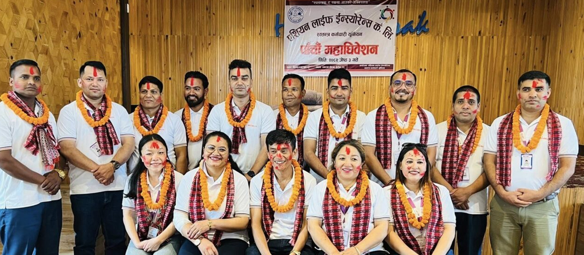 काठमाडौं । एशियन लाइफ कर्मचारी यूनियनको पाँचौं महाधिवेशनले नयाँ नेतृत्व चयन गरेको छ। हेटौंडामा शनिबार सम्पन्न भएको महाधिवेशनले सर्वसम्मतरूपमा १६ सदस्यीय नयाँ कार्य समितिको चयन गरेको हो। नव निर्वाचित कार्य समितिको अध्यक्ष पदमा हिरालाल श्रेष्ठ दोहोरिएका छन्। प्रदेश उपाध्यक्षहरूमा सरस्वती थापा– कोशी, सरोज केसी– मधेश, प्रकाश ढुङ्गाना– बागमती, मुकुन्द कोइराला– गण्डकी, बसन्त भुषाल– लुम्बिनी, तीर्थराज शर्मा– कर्णाली र दिपेश प्रसाद देवकोटा– सुदूरपश्चिम रहेका छन् । यसैगरी महासचिव परमानन्द चौधरी, सचिव शान्ति रेग्मी, कोषाध्यक्ष रश्मी तामाङ, सहकोषाध्यक्ष जीवन बुढाथोकी, सदस्य प्रकाश बहादुर शाही, सुनिल नेपाली, सूर्यनाथ यादव र मन कुमारी राइ चयन भएका छन् ।