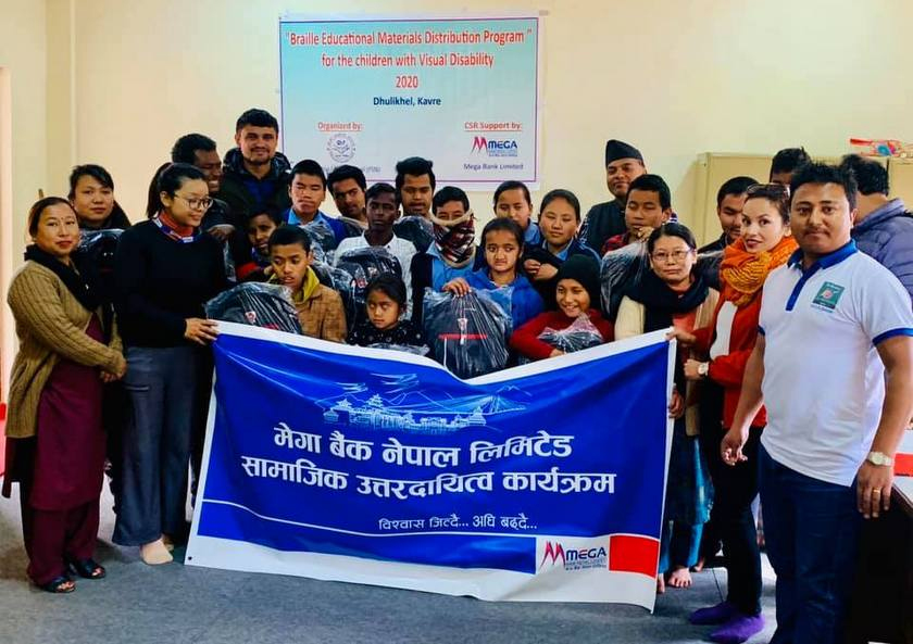 काठमाडौं । संस्थागत सामाजिक उत्तरदायित्वका काममा अग्रणी मेगा बैंक नेपाल लिमिटेडले काभ्रेका दृष्टिविहीन विद्यार्थीहरुलाई शैक्षिक सामाग्री र कम्प्युटर सहयोग गरेको छ । मेगा बैंकले सपोर्ट टु फेलोशिप सोसाइटी नेपाल संस्थामार्फत काभ्रेको धुलिखेलस्थित सञ्जीवनी माध्यमिक विद्यालयमा अध्ययनरत दृष्टिविहीन विद्यार्थीहरुलाई शैक्षिक सामाग्री र कम्प्युटर प्रदान गरेको हो । मेगा बैंकका बनेपा शाखा प्रमुख राजेश्वर श्रेष्ठले दृष्टिविहीन विद्यार्थीहरुलाई कम्प्युटर, दृष्टिविहीन विद्यार्थीहरुले प्रयोग गर्ने विशेष कापी, कलम, झोला तथा बोर्ड हस्तान्तरण गरे । संस्थागत सामाजिक उत्तरदायित्व अन्तरगत मेगा बैंकले बिभिन्न जिल्लाका विद्यार्थीलाई सहयोग गर्दै आएको छ ।