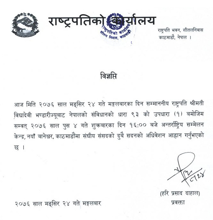 काठमाडौं । सम्माननीय राष्ट्रपति विद्यादेवी भण्डारीले संसदको बैठक आह्वान गर्नुभएको छ । राष्ट्रपति भण्डारीले नेपालको संविधानको धारा ९३ को १ बमोजिम संघीय संसदको दुवै सदनको बैठक आगामी पुस ४ गतेका लागि आह्वान गर्नुभएको हो । मन्त्रिपरिषद्को सोमबार अबेर बसेको बैठकले पुस ४ गतेका लागि संसदको बैठक आह्वान गर्न राष्ट्रपतिसमक्ष सिफारिश गर्ने निर्णय गरे बमोजिम राष्ट्रपतिबाट आज सो दिनका लागि संसद बैठक आह्वान भएको हो । संघीय संसदको दुवै बैठक पुस ४ गते ४ः०० बजेका लागि बोलाइएको छ ।