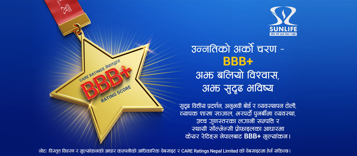 काठमाडौं । सन नेपाल लाइफ इन्स्योरेन्स कम्पनी लिमिटेडले आफ्नो वित्तीय सुदृढता र दायित्व पूरा गर्ने क्षमतामा उल्लेखनीय सुधार गर्दै केयर रेटिङ्स नेपाल लिमिटेडबाट बीबीबीप्लस रेटिङ प्राप्त गरेको छ। यो रेटिङले कम्पनीको विश्वसनीयता, सुदृढ वित्तीय प्रदर्शन, अनुभवी व्यवस्थापन टिम , सशक्त प्रशासनिक प्रणाली र उच्च गुणस्तरको लगानी पोर्टफोलियोलाई झल्काउँछ।बीबीबीप्लस श्रेणीमा पर्ने कम्पनीहरूलाई आफ्ना दायित्वहरू समयमा पूरा गर्न सक्षम र अपेक्षाकृत स्थिर वित्तीय स्थिति भएको मानिन्छ। कम्पनीले ग्राहक वर्ग, अभिकर्ता र शेयरधनीहरूको निरन्तर विश्वासका लागि आभार प्रकट गर्दै अझ सुदृढ र जिम्मेवार बीमा सेवा प्रदान गर्ने प्रतिबद्धता ब्यक्त गरेको छ । हाल कम्पनीको देश भरिमा १४८ शाखा तथा उप शाखा बाट सेवा संचालनमा रहेको छ।